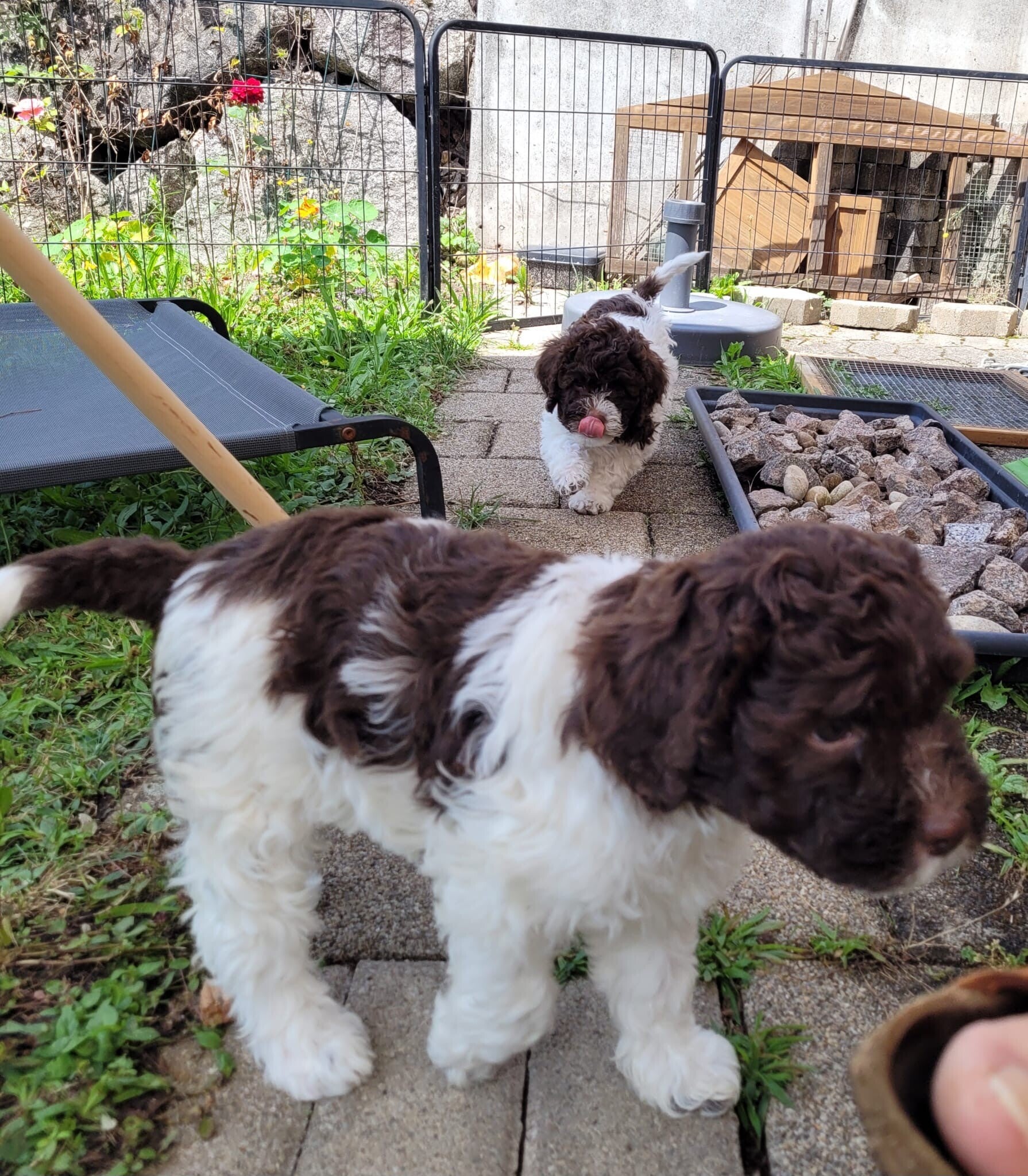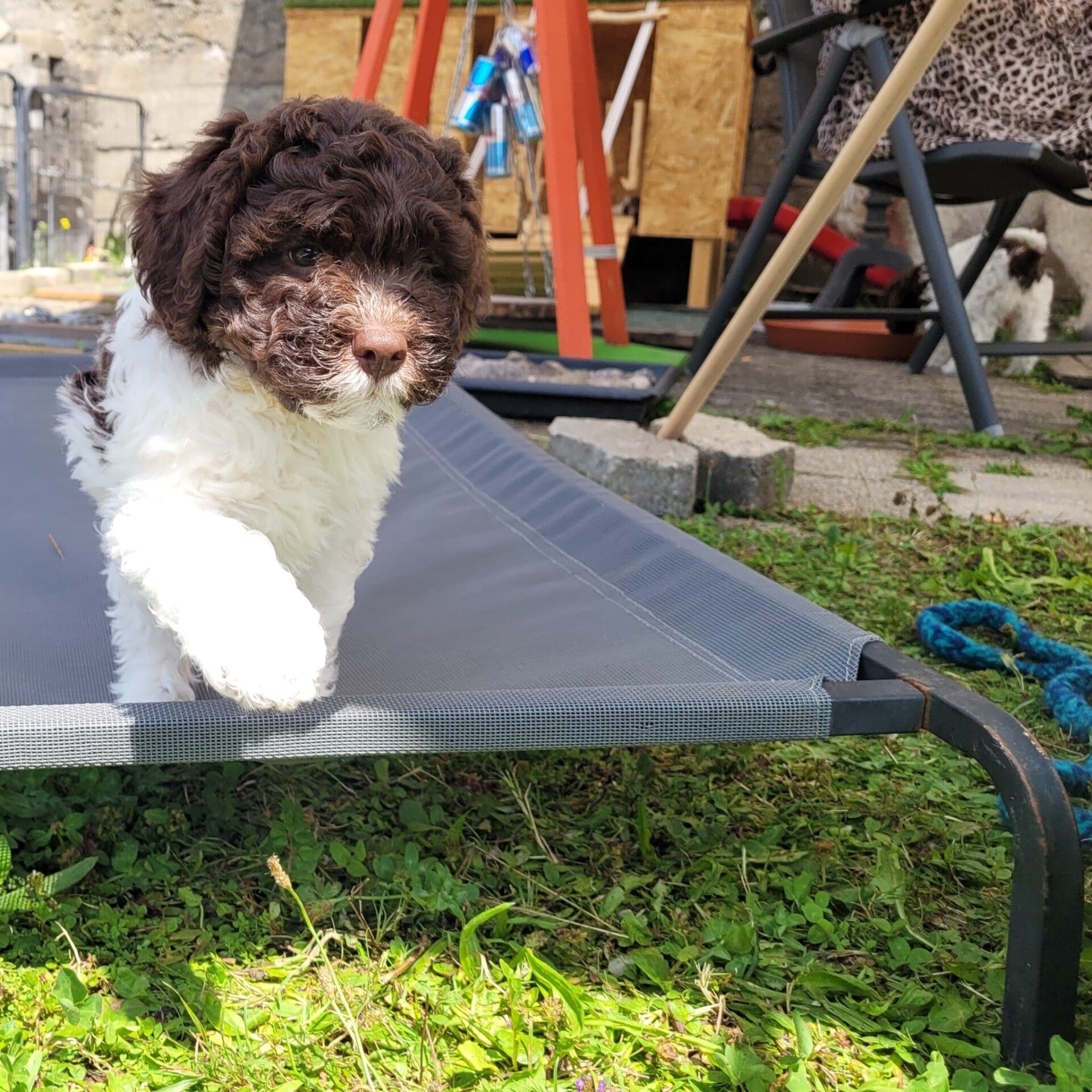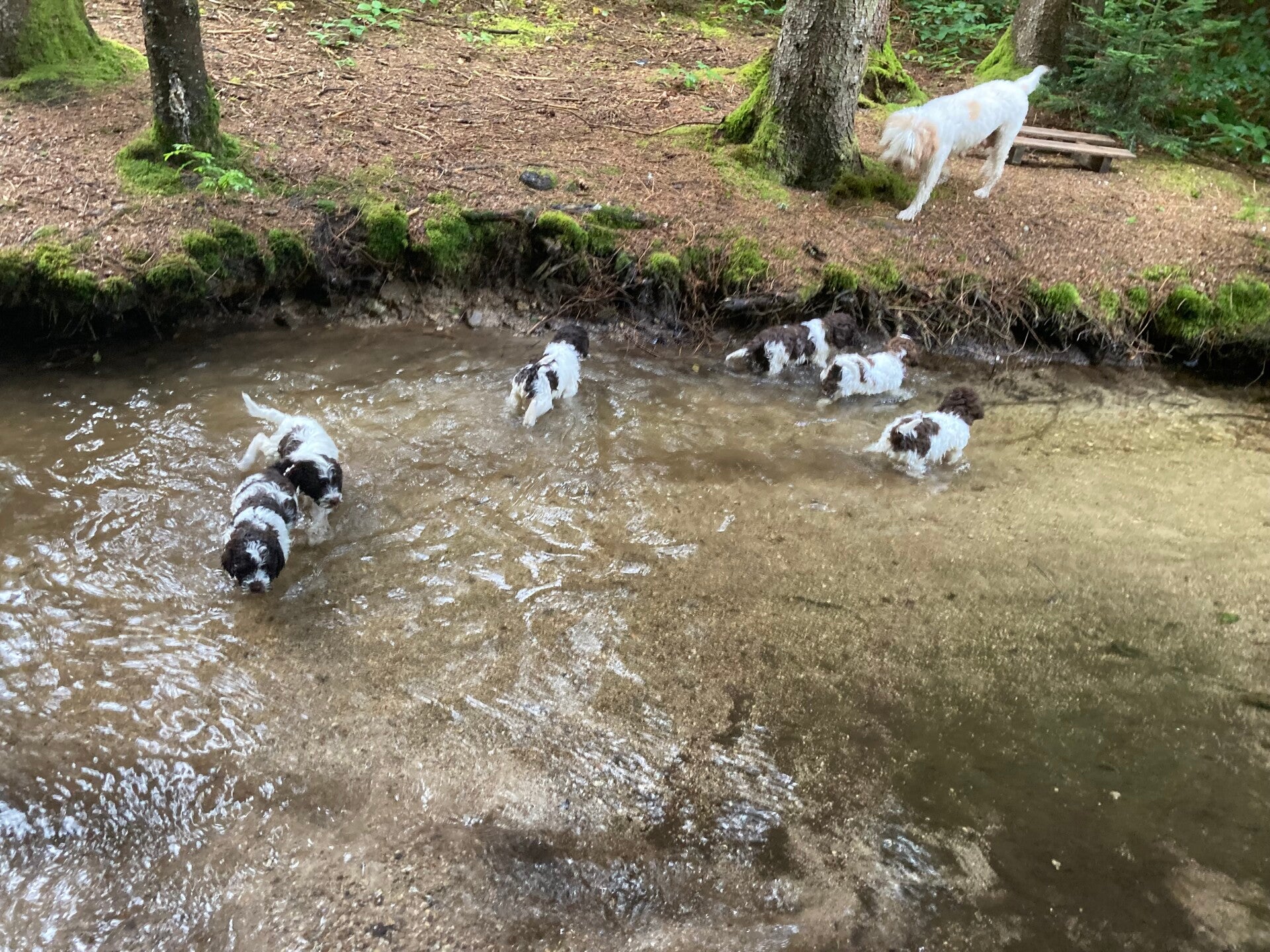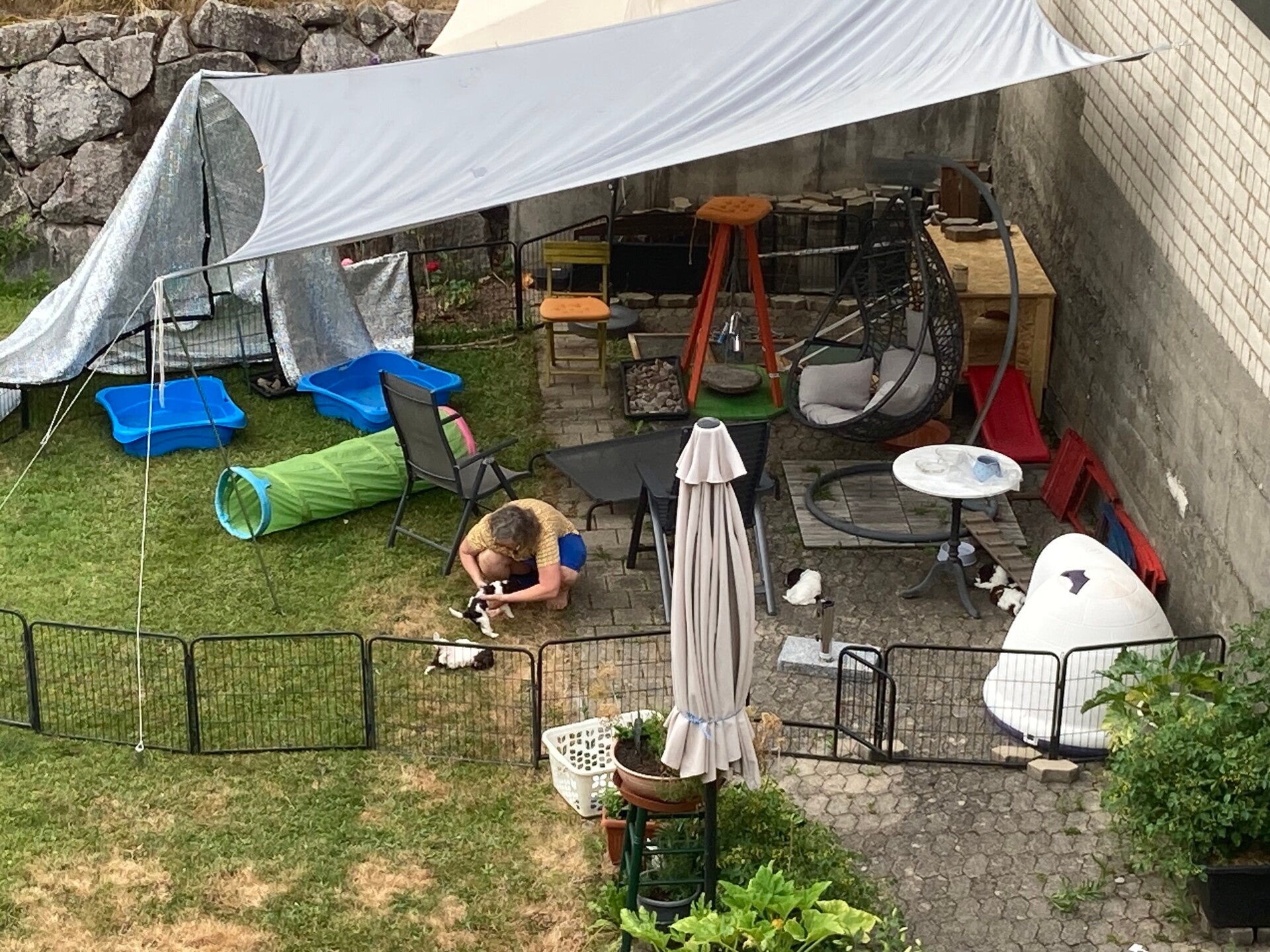 In der 4. Woche genießen die Welpen mit ihrer Mama Jelka Ausflüge in den Garten.