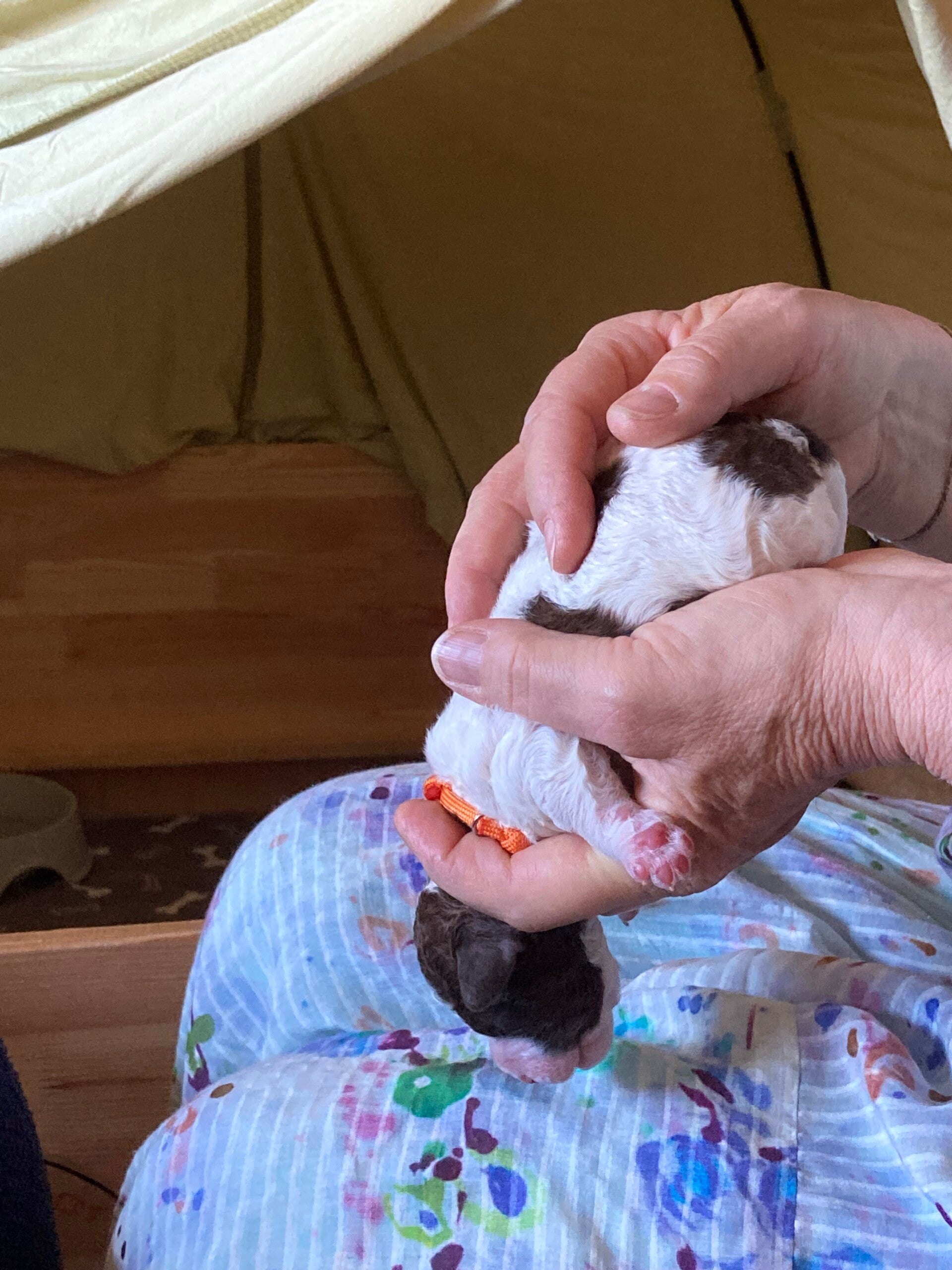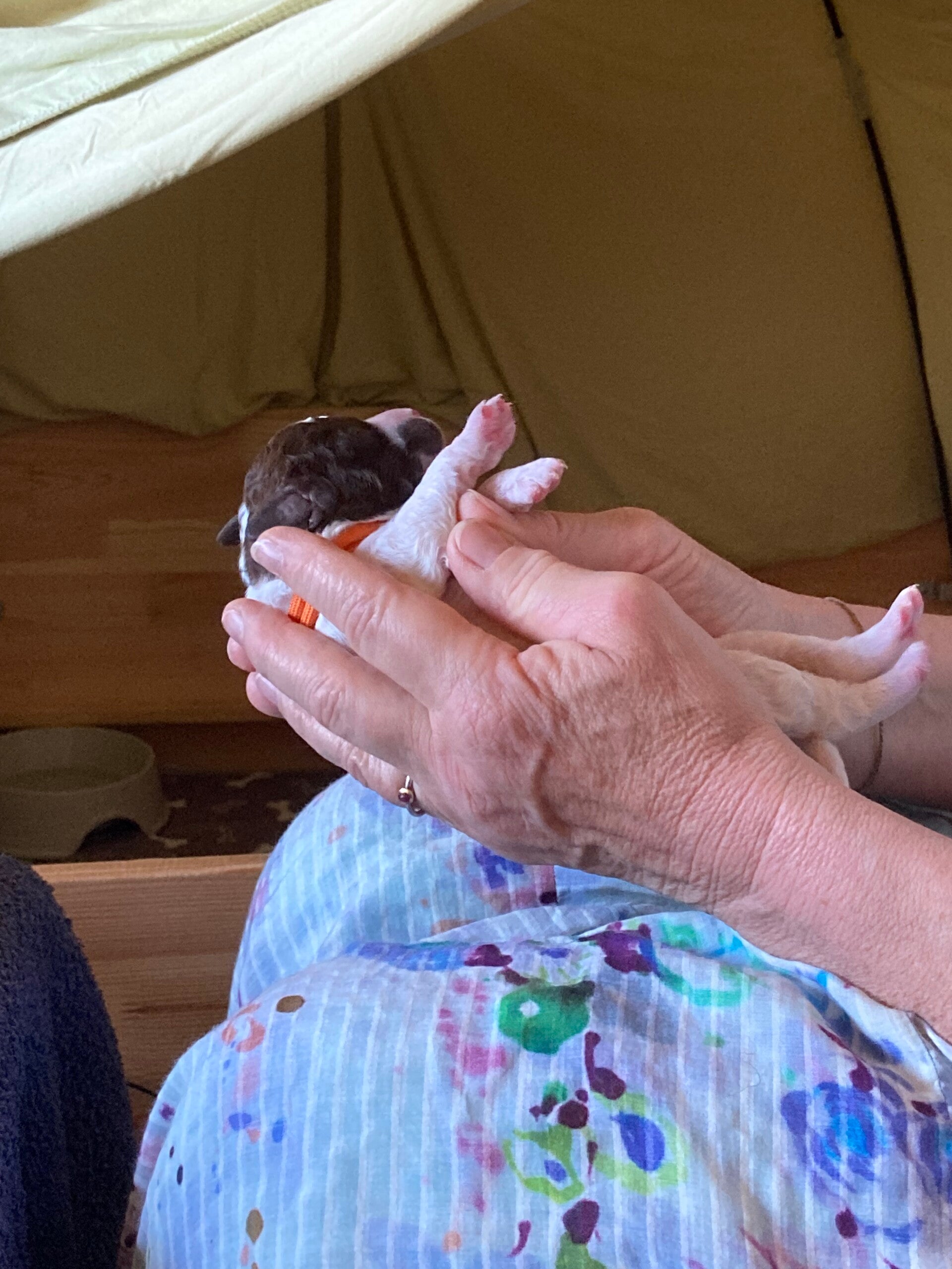 Vom 3. Lebenstag erhalten die Welpen wie hier Alma täglich einmal für kurze Zeit eine sensorische Frühförderung.