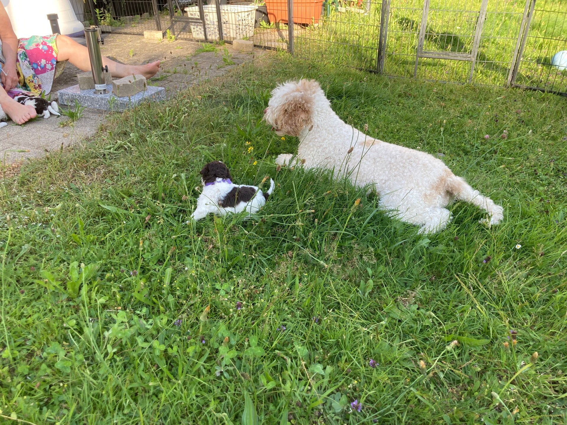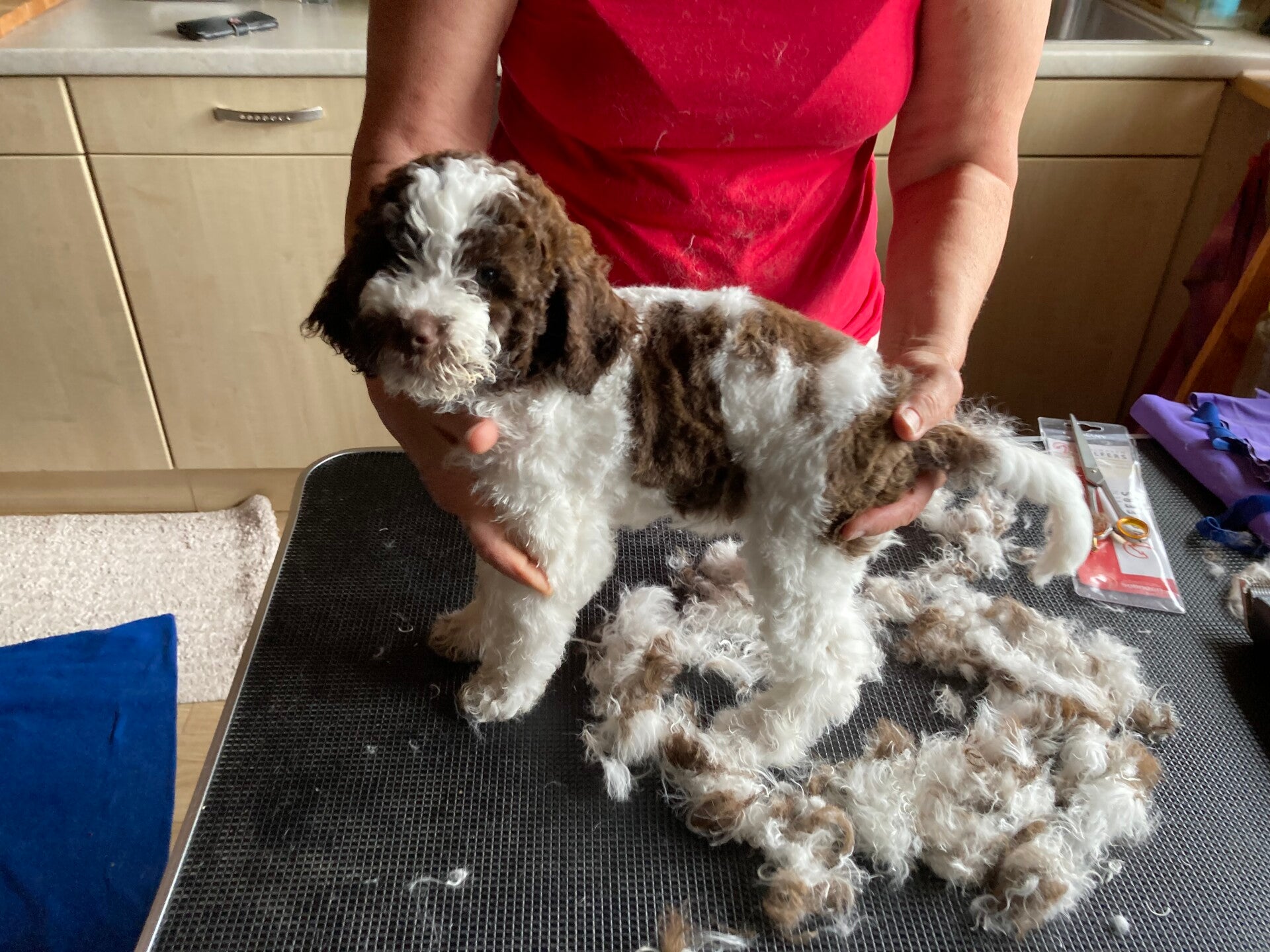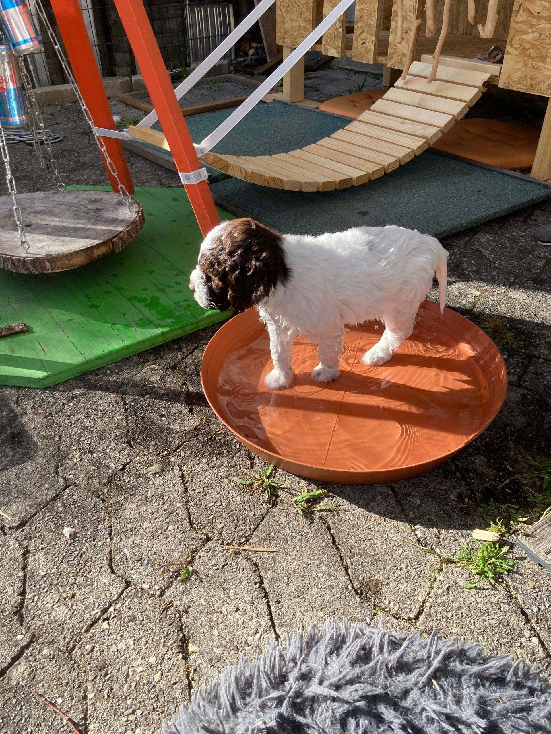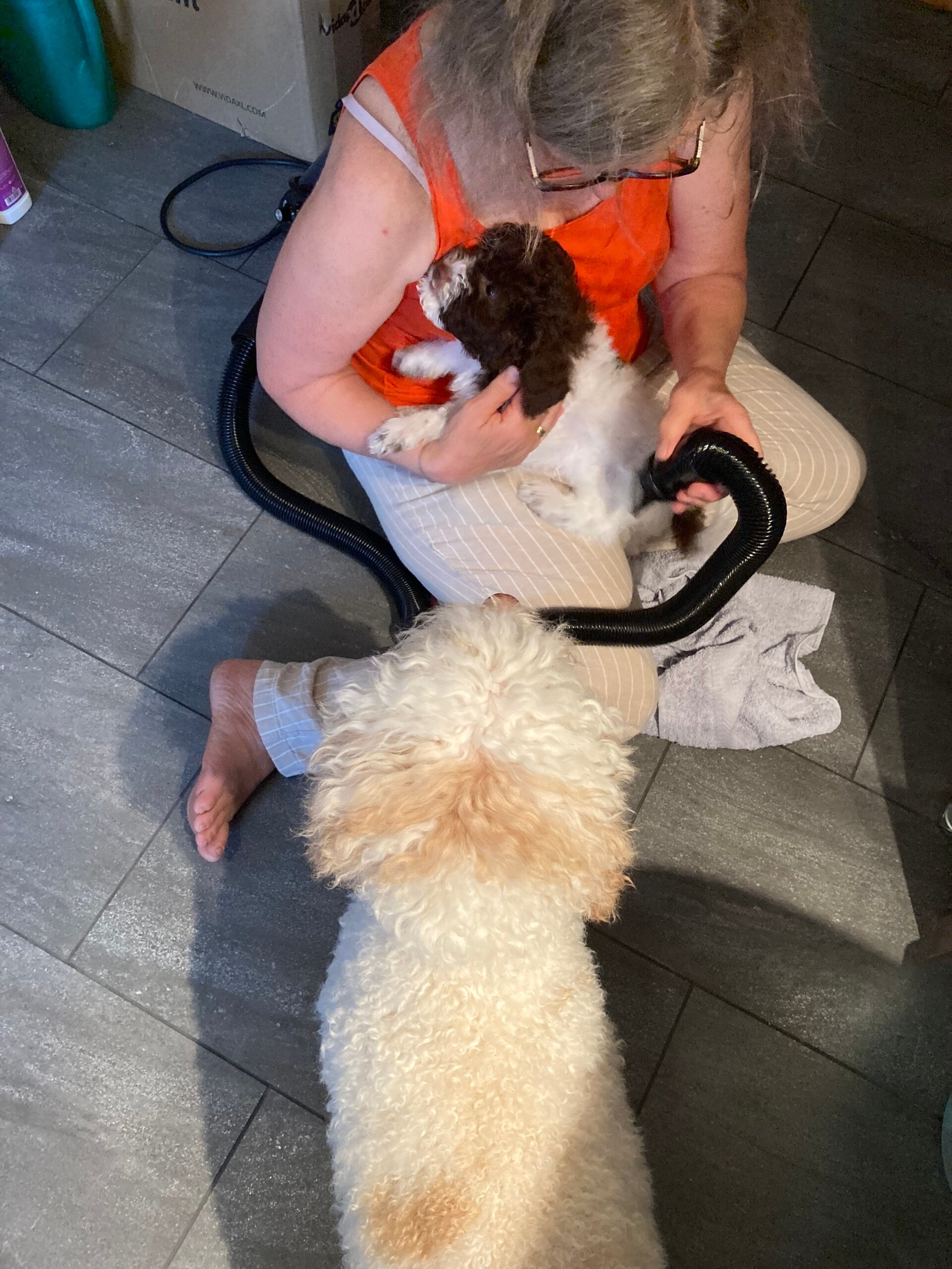 Ende der 7- Woche ist der Hund einer Freundin zu Besuch. Die Welpen werden auch ans Duschen, Fönen und Scheren herangeführt.
