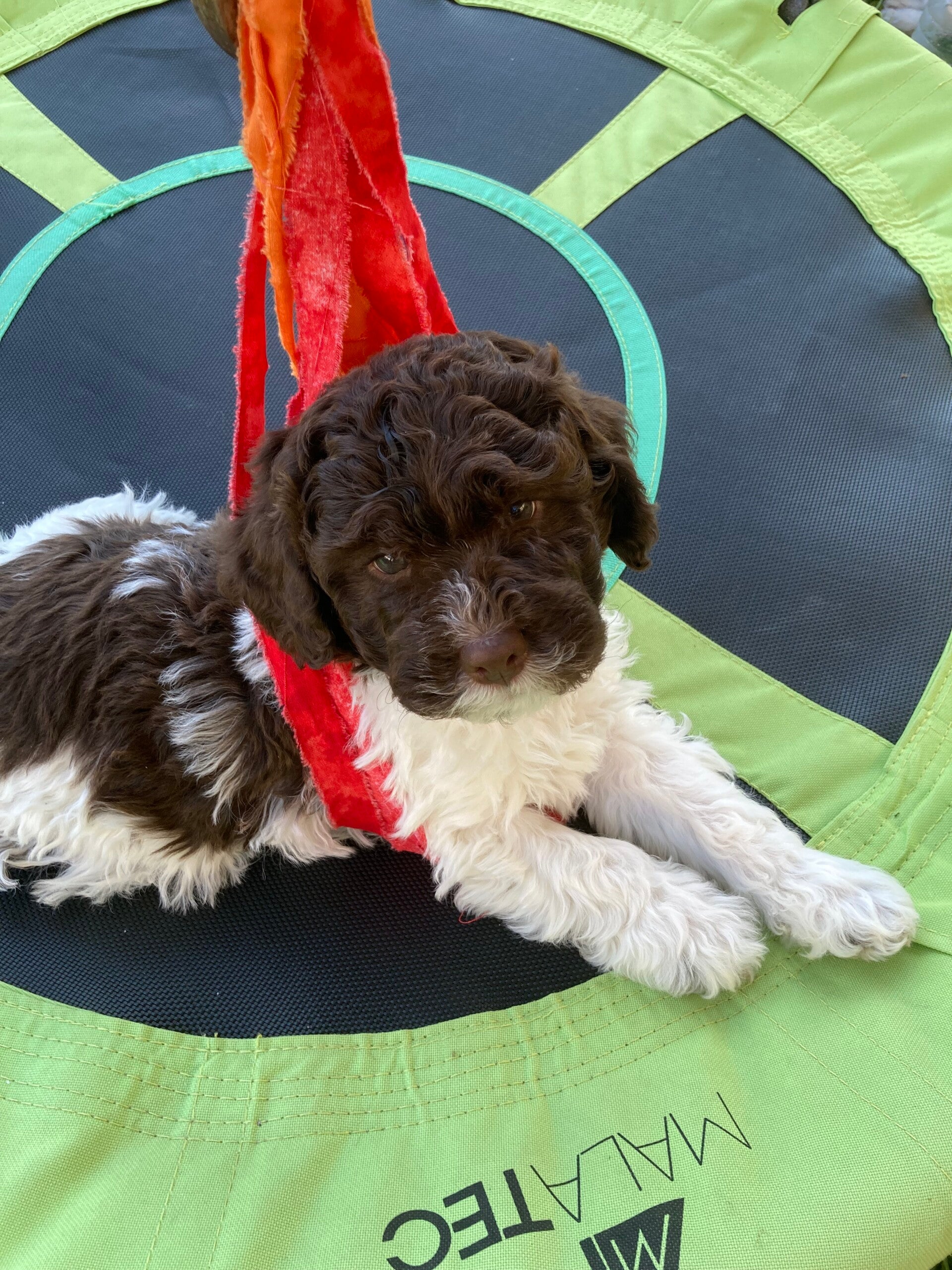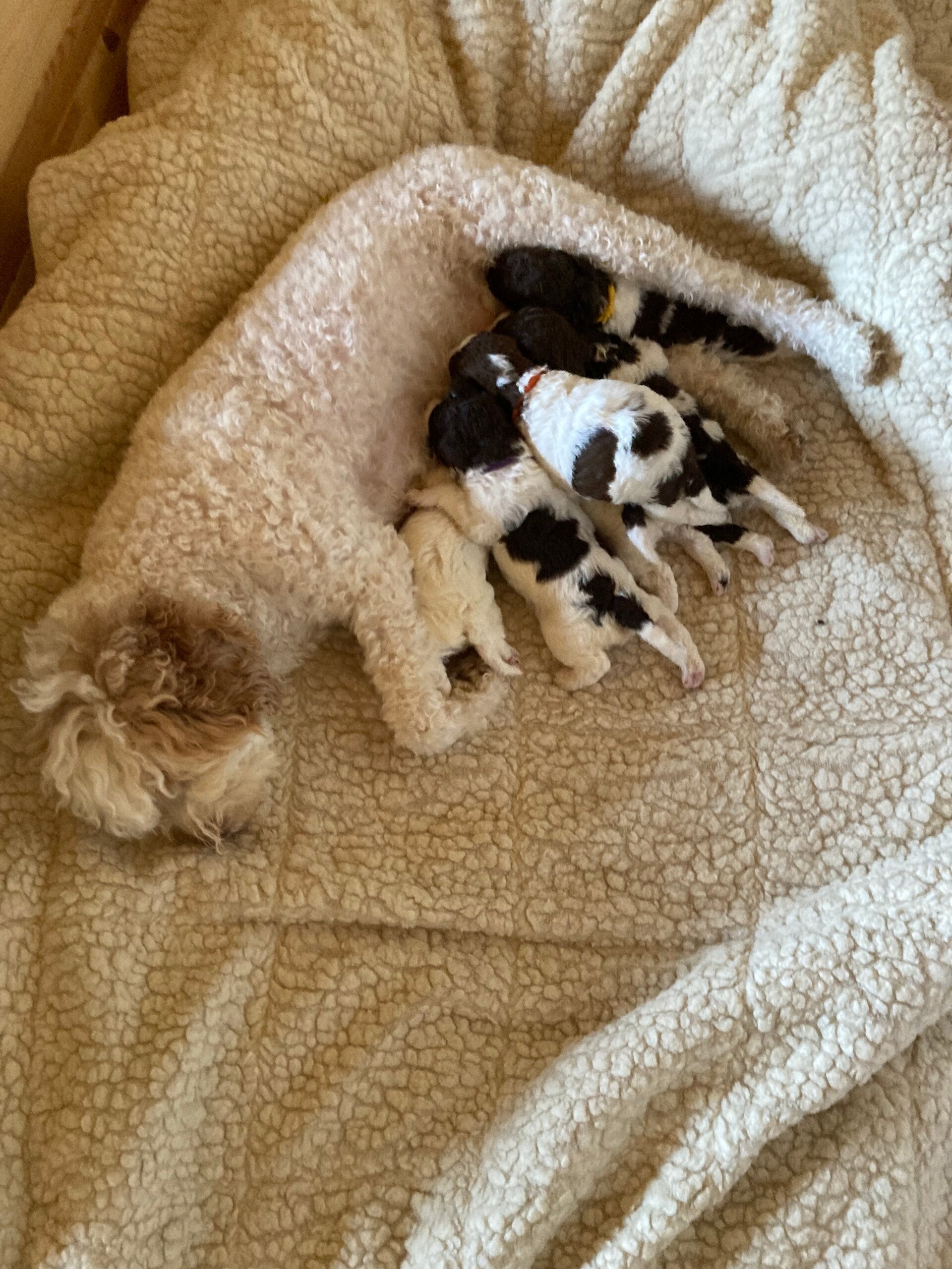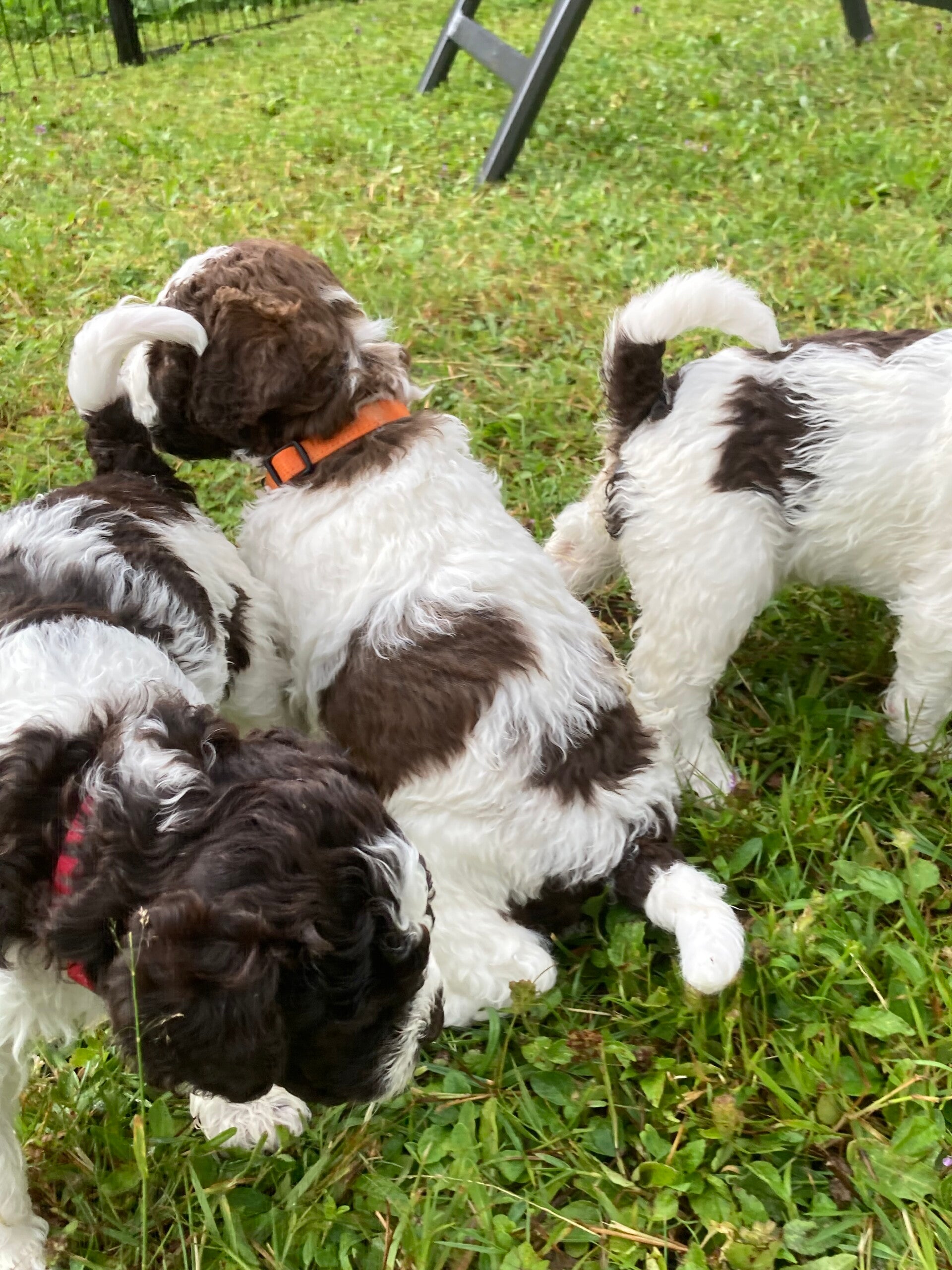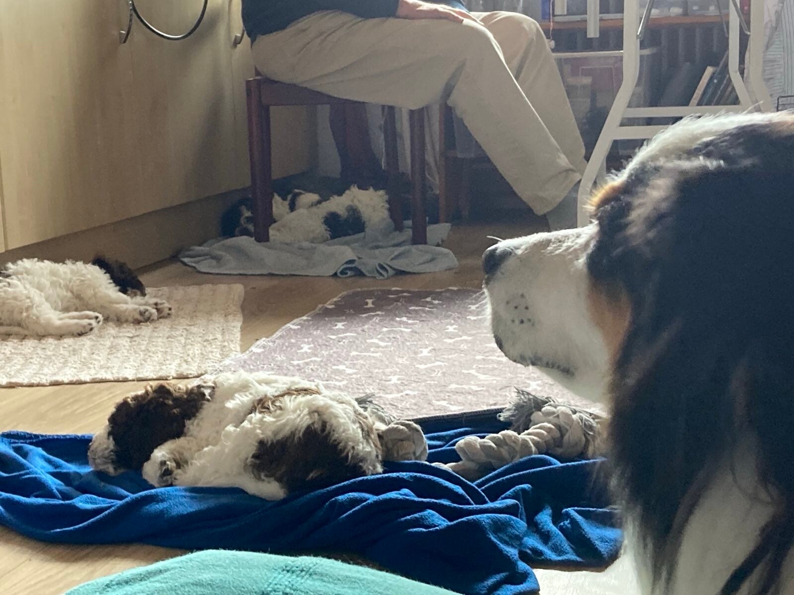 Ende der 7- Woche ist der Hund einer Freundin zu Besuch. Die Welpen werden auch ans Duschen, Fönen und Scheren herangeführt.