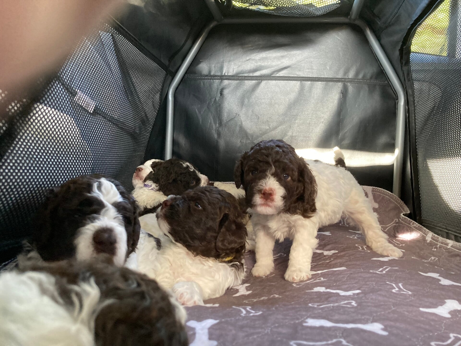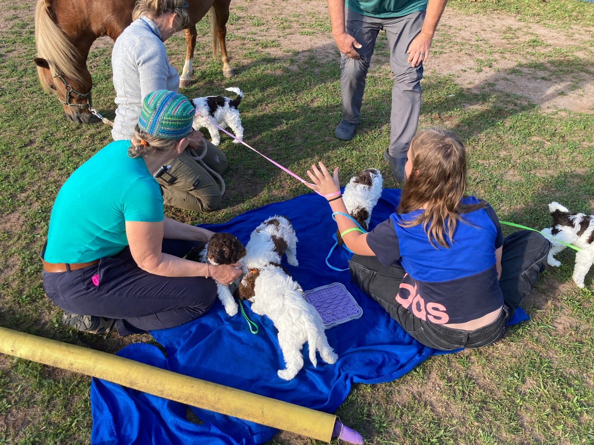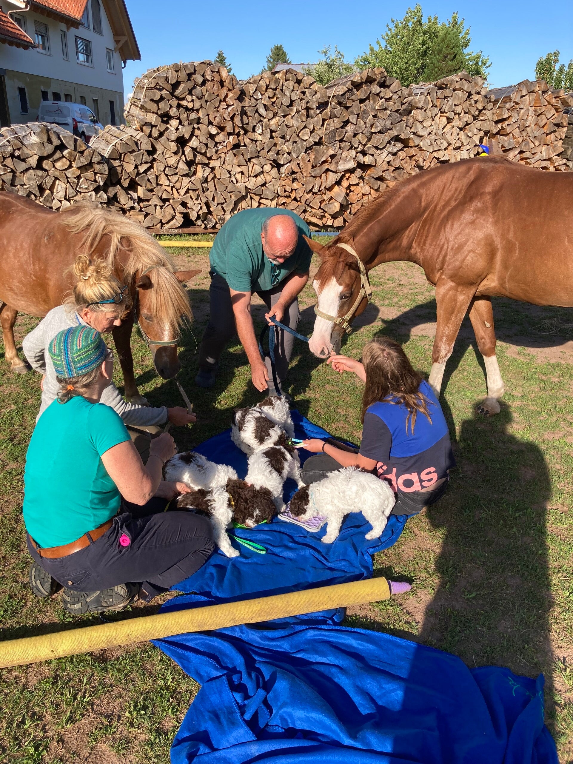 In der 7. Woche hatten die Welpen u.a. eine Begegnung mit Pferden. Sie erleben das im Auto mitfahren völlig normal ist. Auch der Aufenthalt in einem Fahrradanhänger gehörte zu der Sozialisation der Welpen.