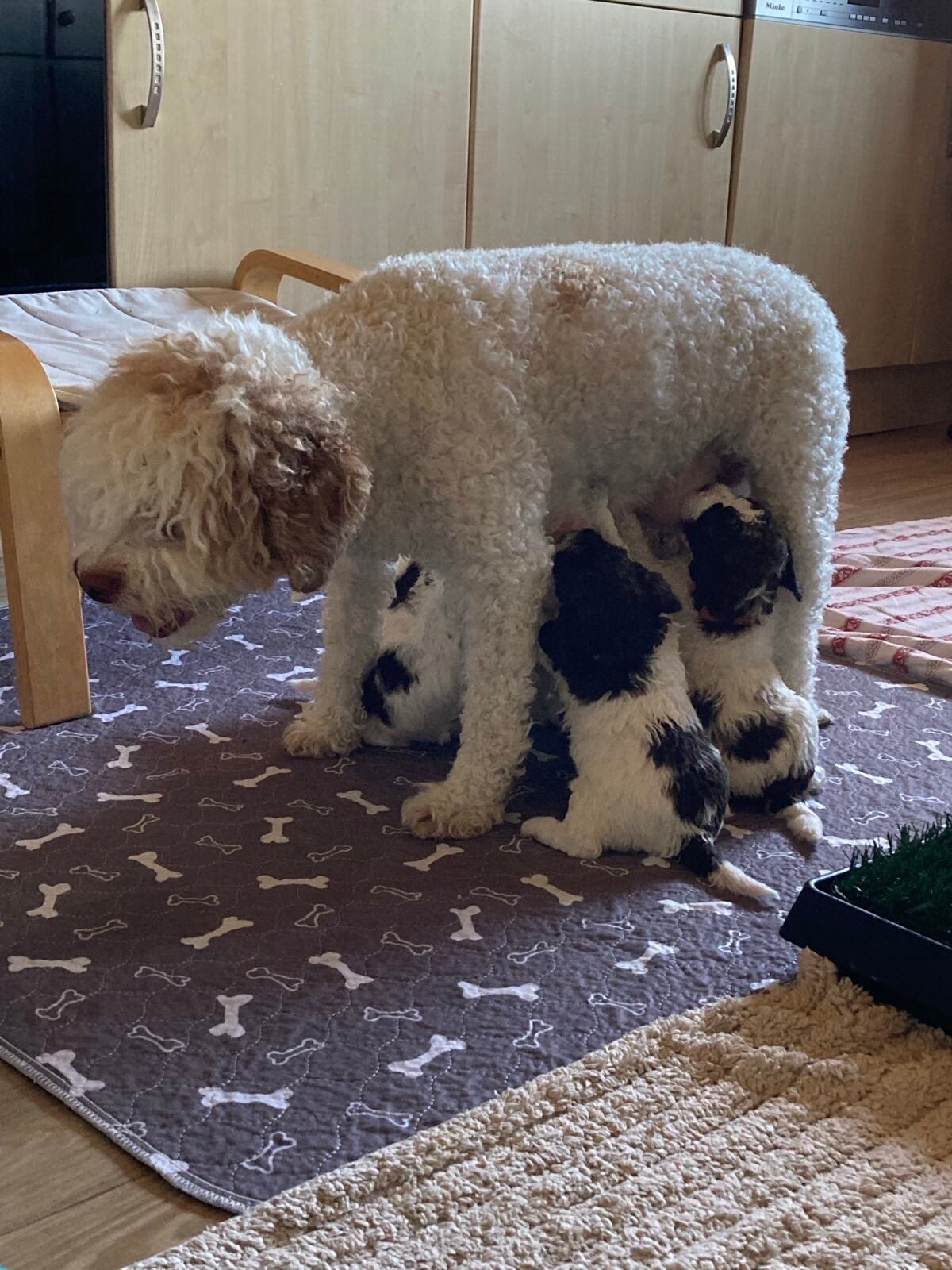 Unsere Hündin kümmert vorbildlich um ihre Welpen